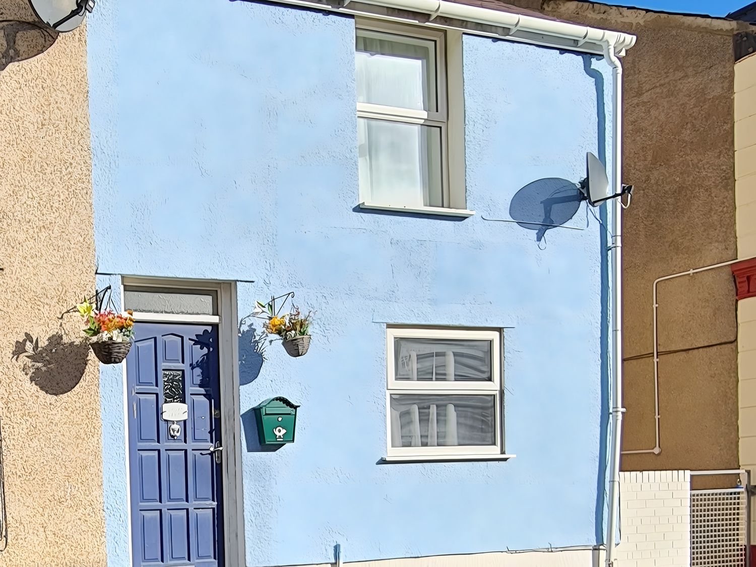 • An exterior view of a house with a blue door and window at Blue Haven in Penmaenmawr