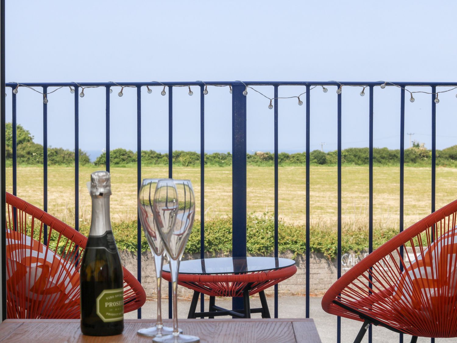 • A balcony with red chairs a small table a bottle of prosecco and two glasses at Azure in Carbis Bay