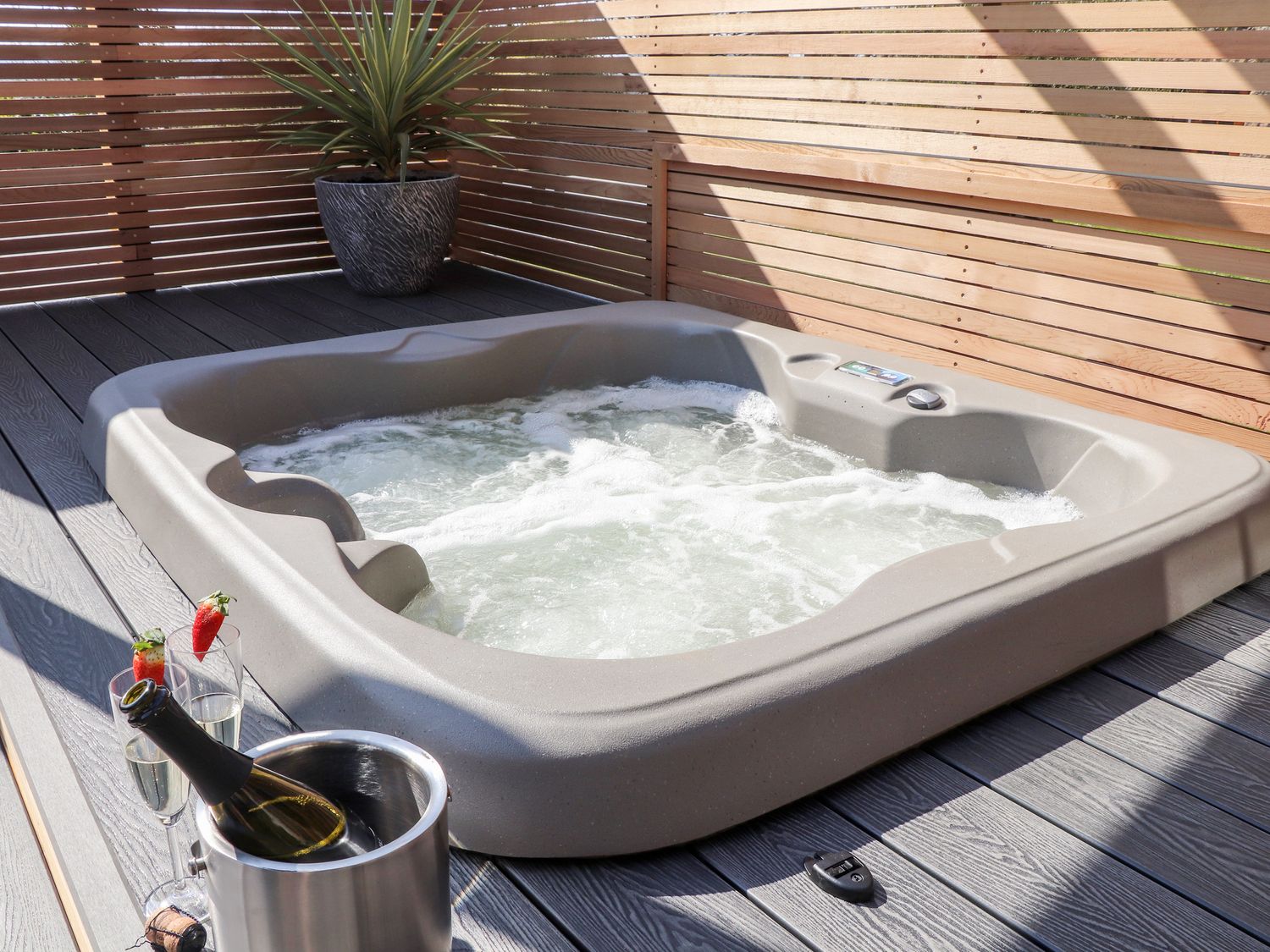 • An outdoor hot tub on a wooden deck with a potted plant and two glasses of champagne with strawberries at Rosewarrick Cottage in Lanivet