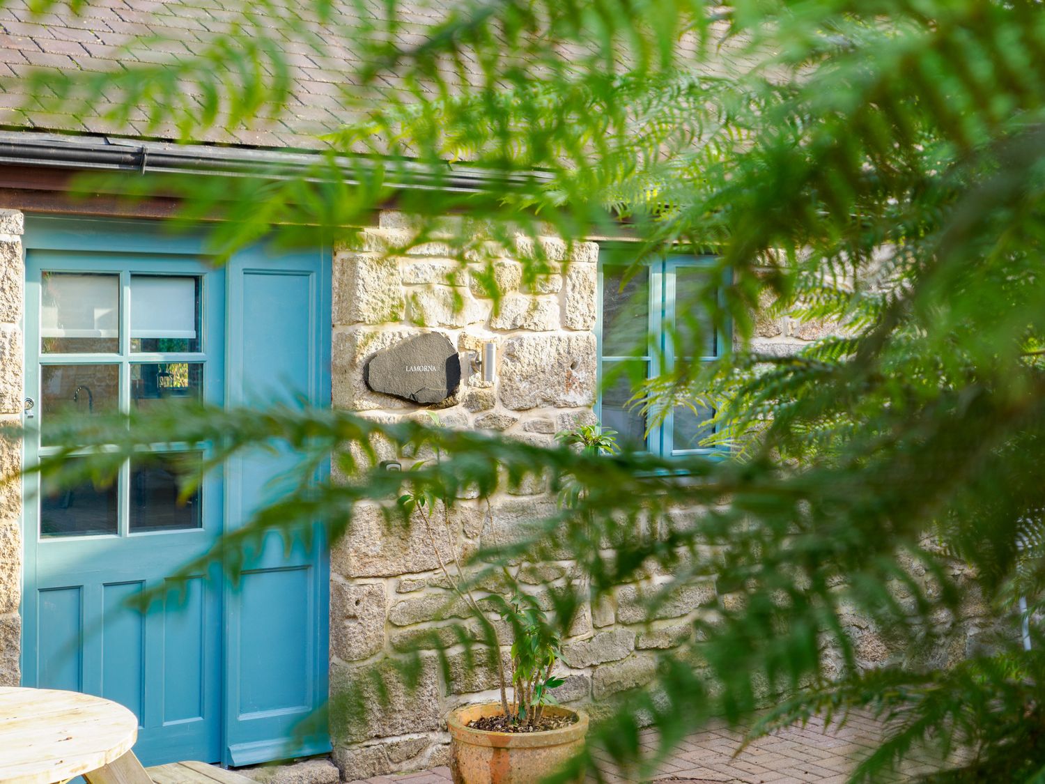 • A stone building with a blue door and window partly obscured by green fern leaves at Lamorna in Mawnan Smith Near Falmouth