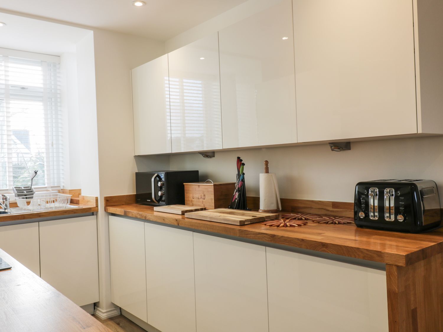 The kitchen is well-equipped with a full collection of appliances including a coffee grinder and filter machine to help kick start your day.
