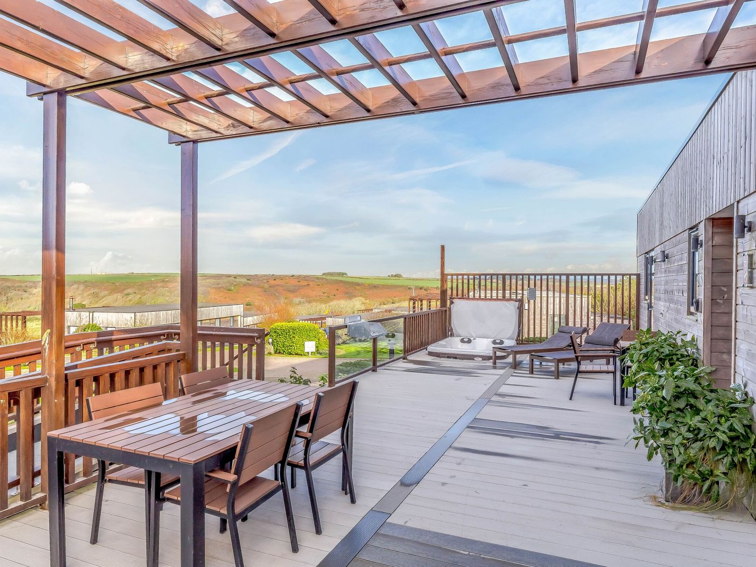 Step outside onto the enclosed decking, where you can relax and soak up the sun on the outdoor furniture, or indulge in a dip in the hot tub.