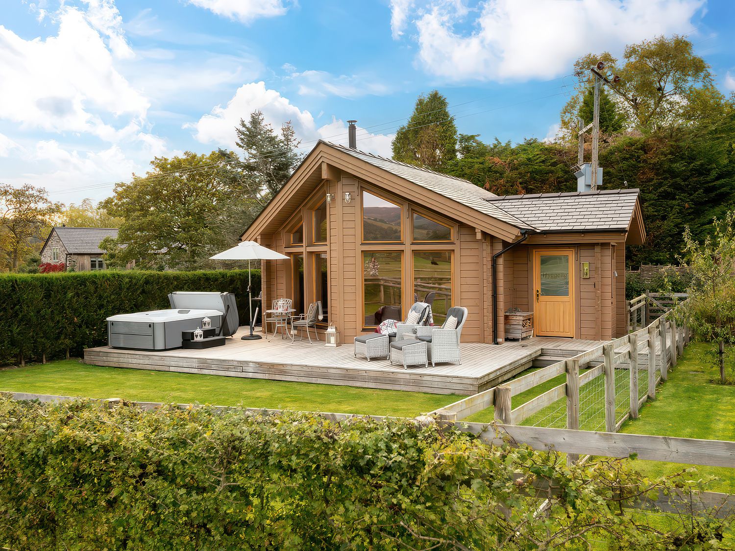 Outside, a private decking and lawn area provides a pleasant spot to relax in the open air, with outdoor furniture for quiet moments, a barbecue for alfresco dining, and a hot tub where you can unwind beneath the evening sky.
