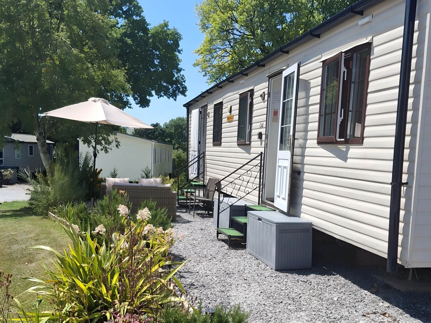 • An outdoor area with a caravan, chairs, and an umbrella at Llanarmon-yn-Ial Mold 3-Bed Caravan, Sleeps 6 Llanarmon-Yn-Ial