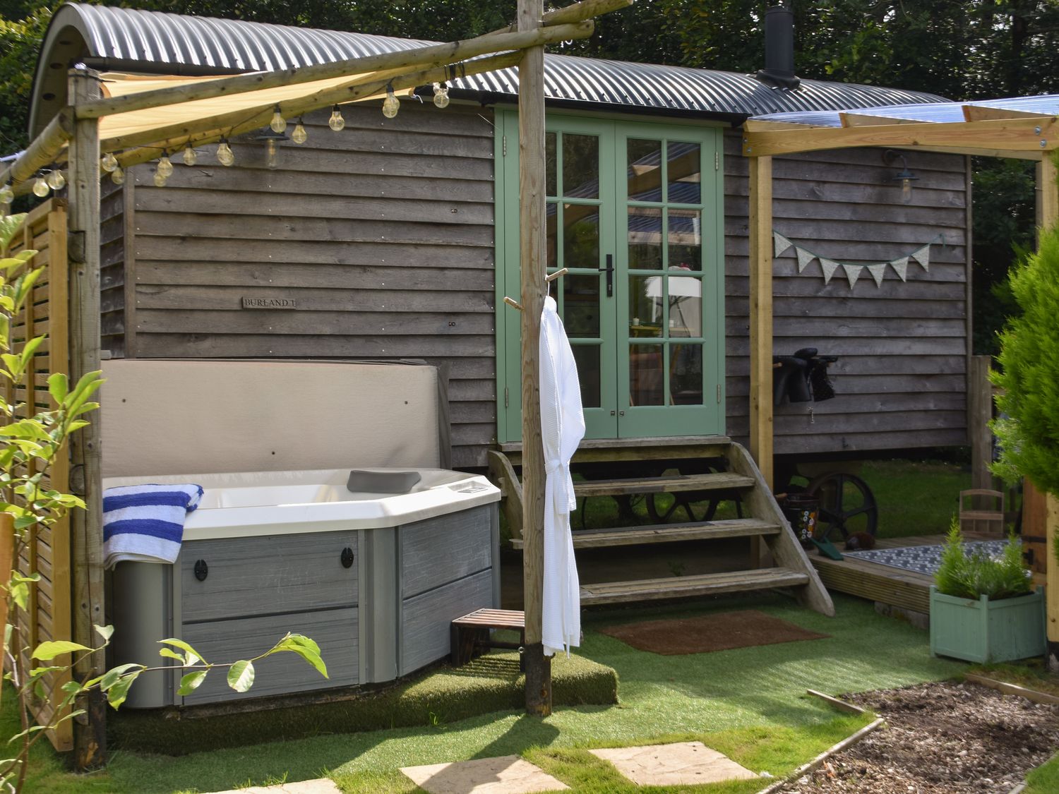 • An outdoor area with a hot tub and wooden steps leading to a structure with green double doors at Burr 1 Shepherds Hut in Barnstaple