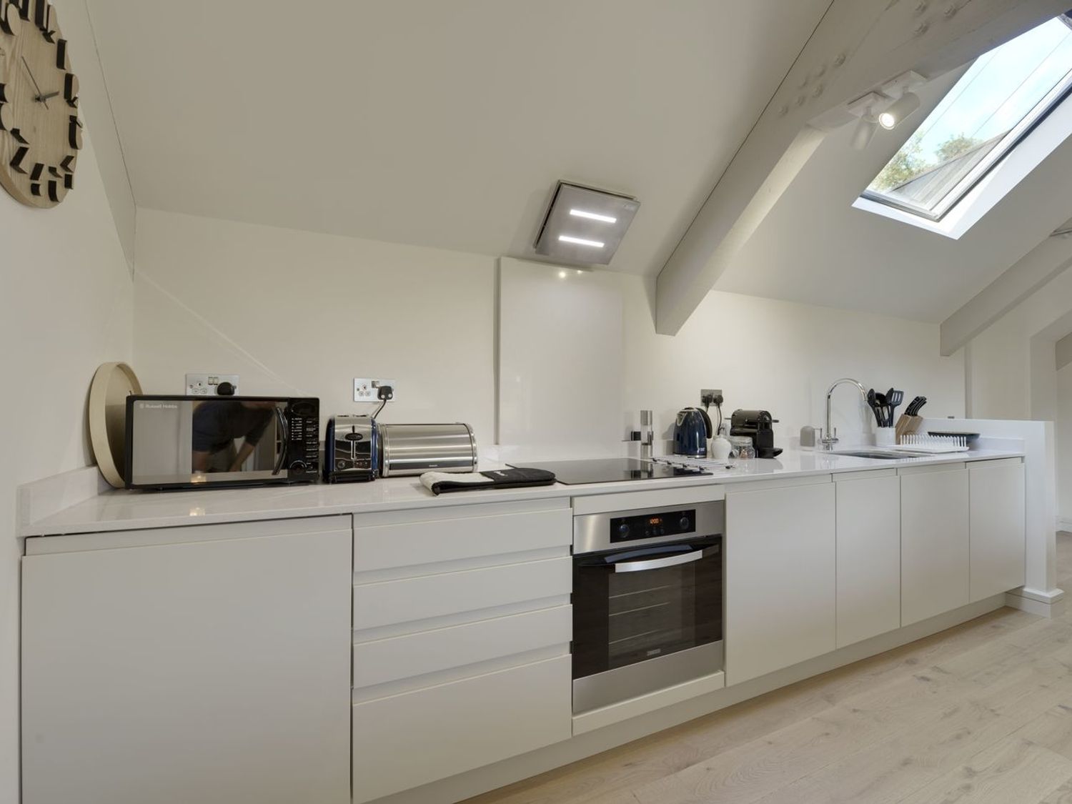 Large, bright, airy open-plan room. Two bedrooms, both ensuite. Well-equipped kitchen area. Welcome bottle of wine with flowers and coffee machine capsules. Tremendous view from the Juliet balcony. Quiet and peaceful location. The housekeeper, Lisa, went out of her way to get help when we had a problem with the wi-fi connection. Unfortunately the Talaton Arms's kitchen was closed for holidays so we were unable to eat there. The village shop is a very short walk away.