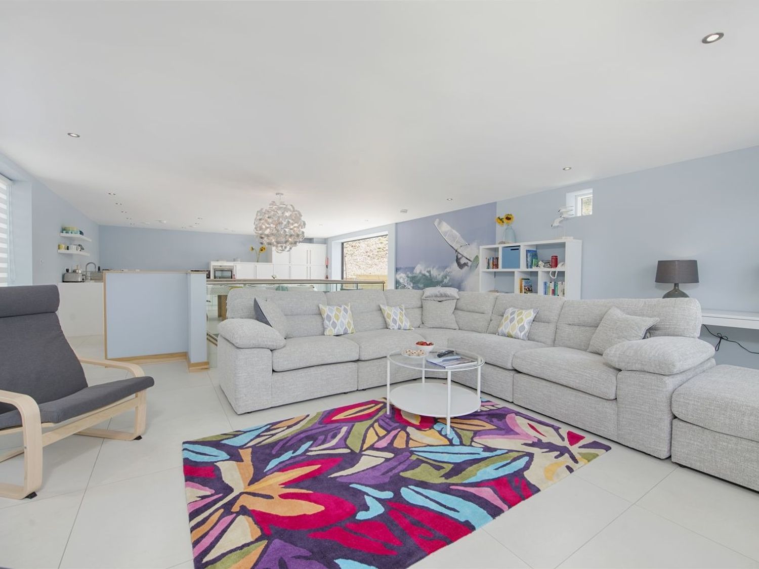 From the hall, stairs sweep up directly into the stunning open plan living space where you can chill out in the comfy seating area, cook in the well equipped and fresh kitchen area and gather together around the central table for fun family meals.