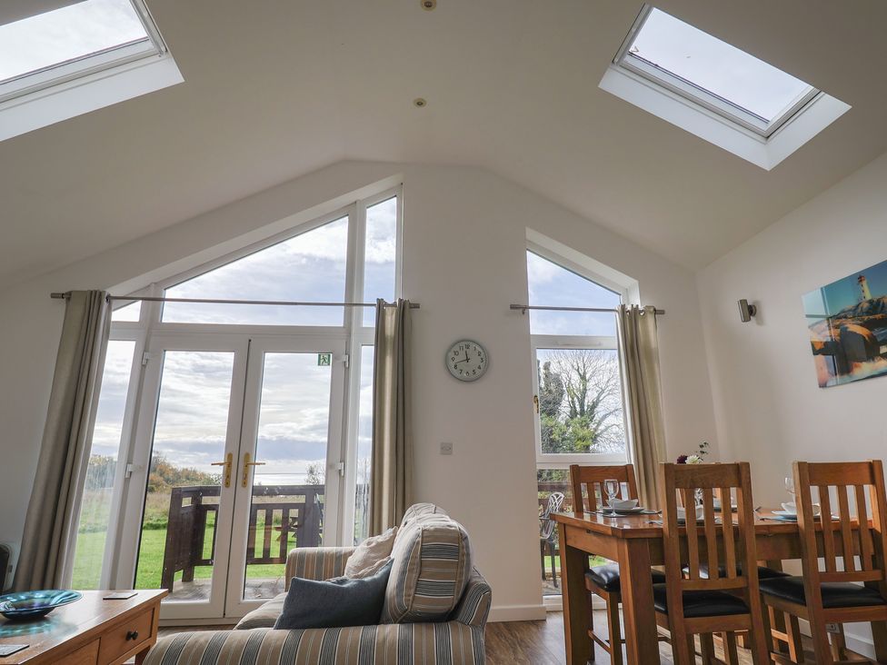 ...a wonderful expanse of field directly outside the chalet which our dog needed no encouragement to explore. An awesome view of the surrounding countryside and sea made for a perfect setting. The chalet itself (definitely more of a chalet than a cottage) was lovely! Spacious, very nicely furnished and immaculately clean. Great layout with sitting room, dining area and kitchen all in one open plan unit and two very comfortable bedrooms and modern bathroom off this area. Great heating, so lovely and warm and powerful shower over bath in the bathroom.
