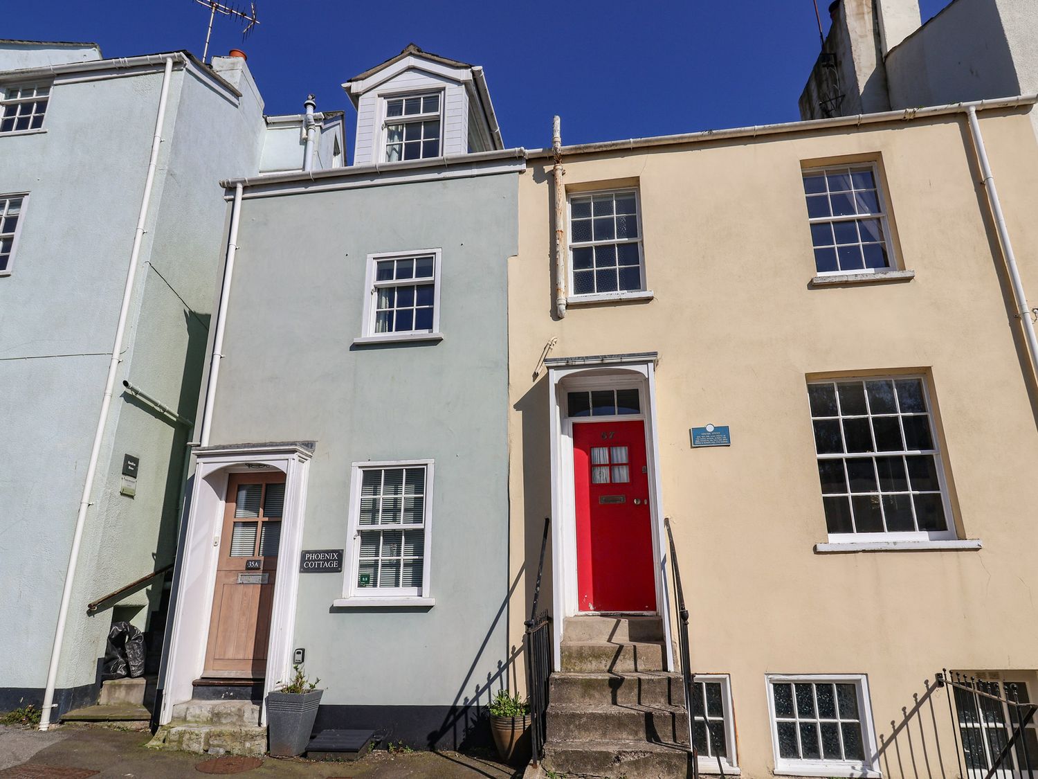 • A house exterior with a blue and yellow facade at Phoenix Cottage in Lyme Regis