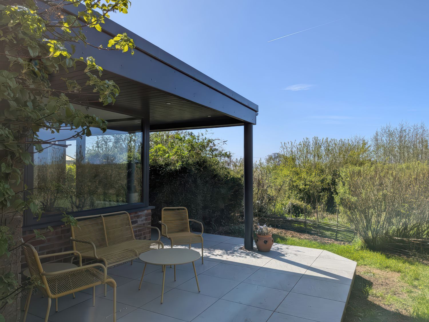 Outside, a private garden and covered veranda create a sheltered spot for fresh air at any time of day, from morning coffee to watching the light shift across the valley in the evening.