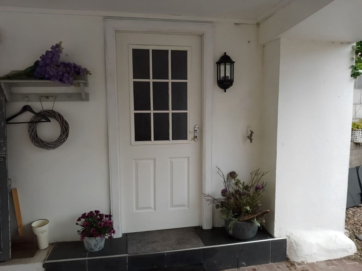 • An entrance with a door and flower arrangements at 14 Largo Road in Leven