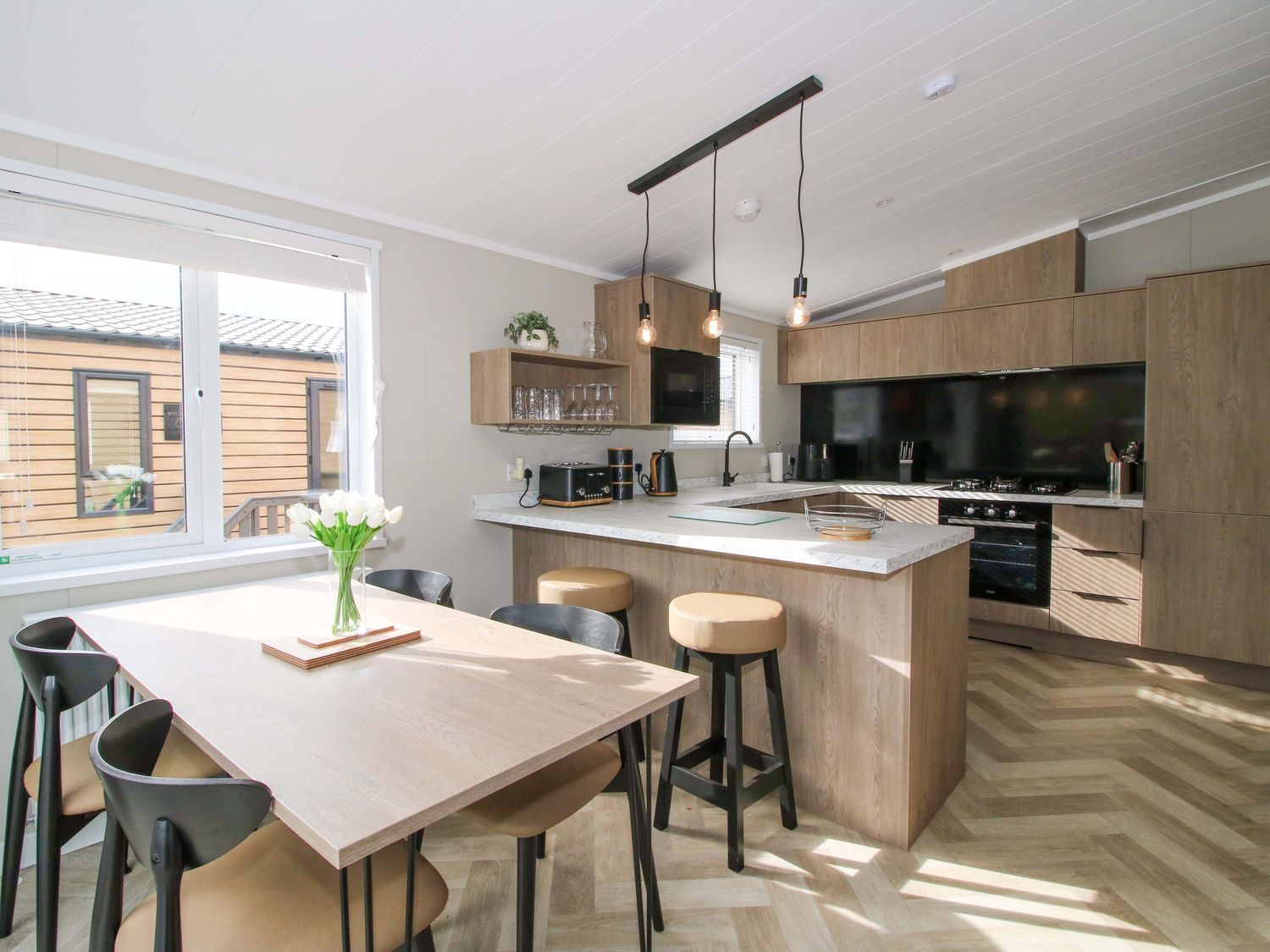 Sliding doors draw you out onto the decking, where you can linger over an evening drink on the patio furniture while the park quietens around you.