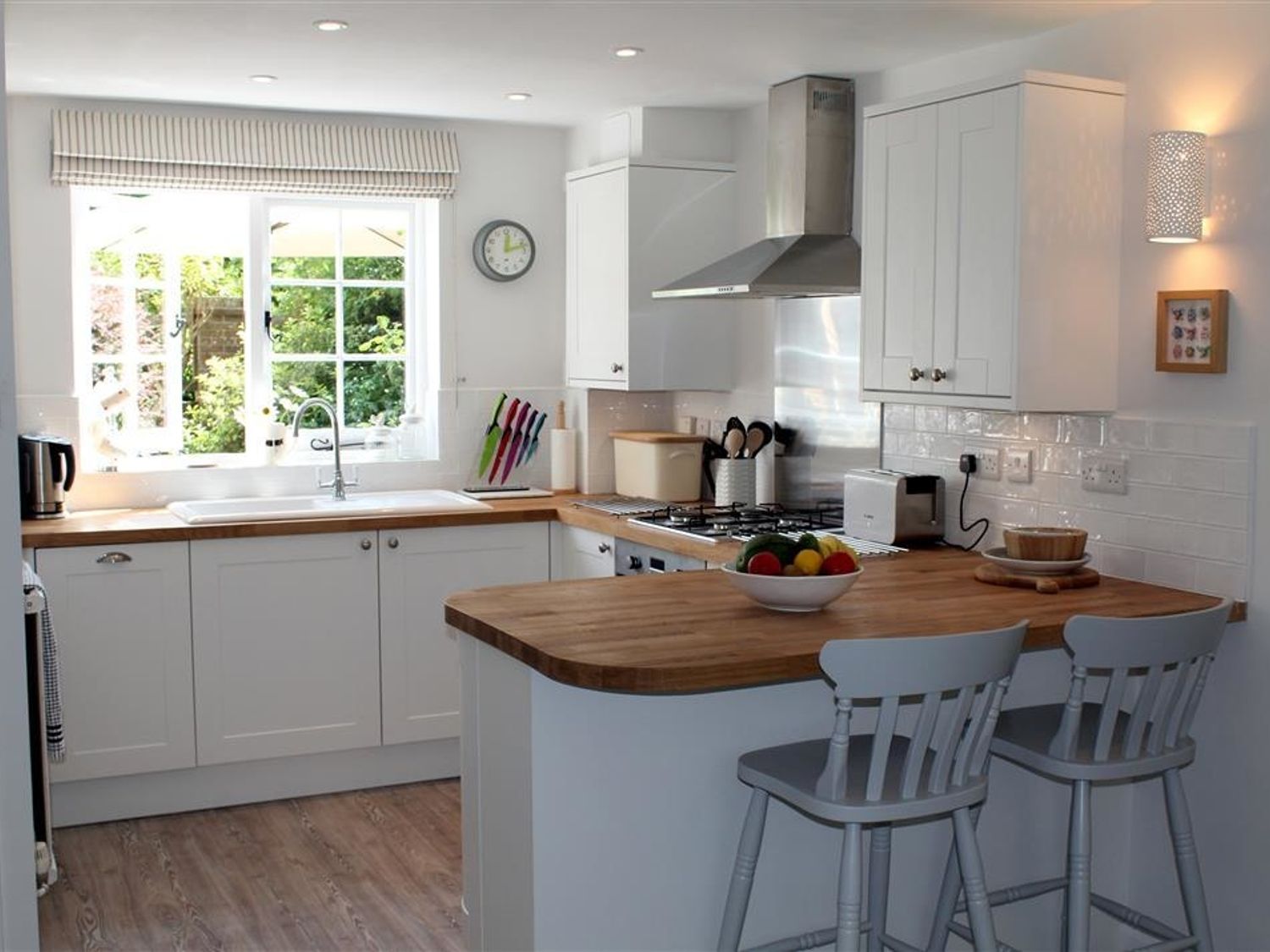 There is a fireplace that is for decoration only, and a fitted kitchen with a breakfast bar.