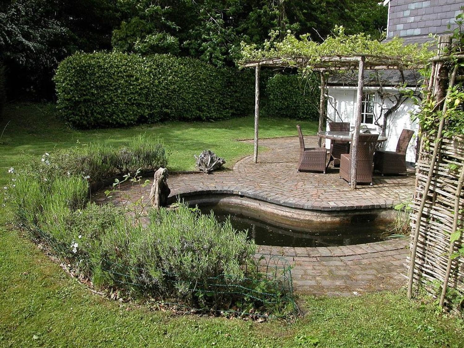 - Enclosed lawned garden with pond, shaw of light woodland, logstore