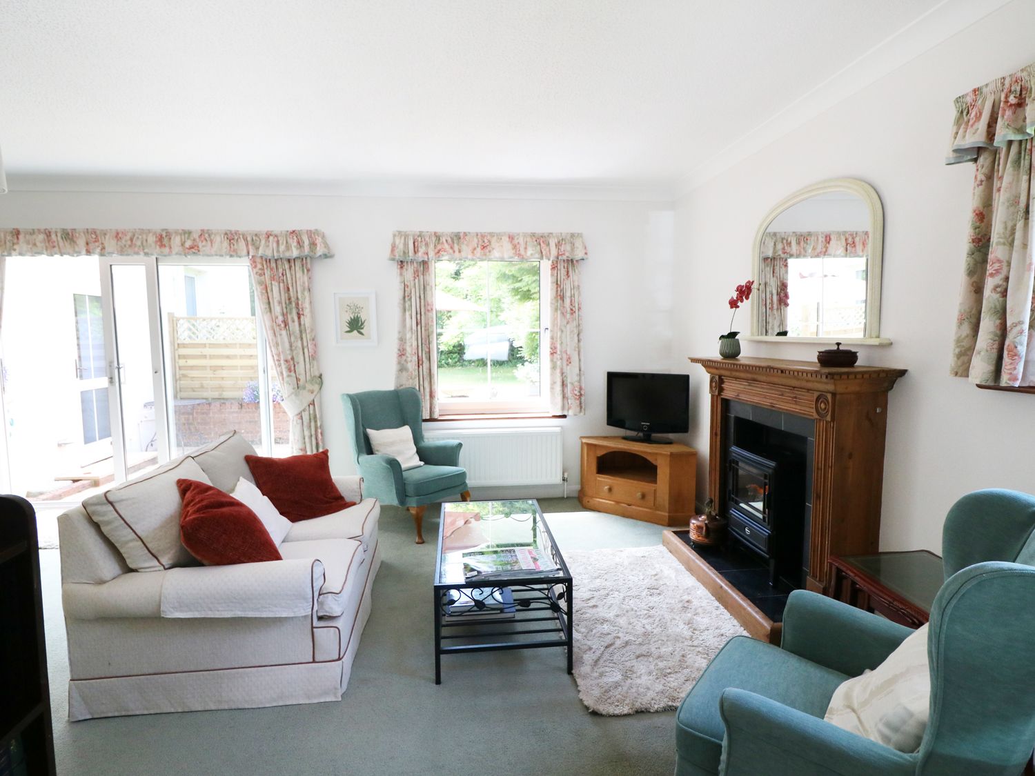 The room also features patio doors leading out to the garden with patio and lawn area.