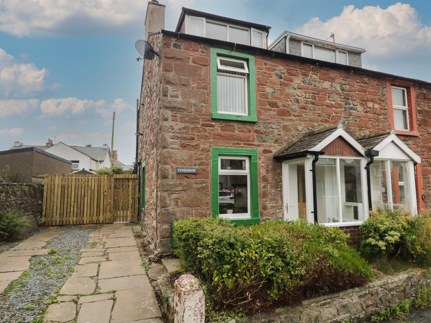 • An exterior view of a house with a garden and pathway at Yewbarrow in Seascale