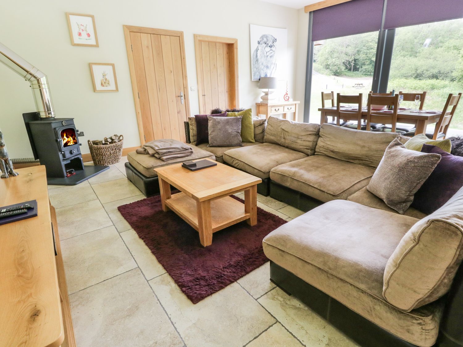 - Open plan living area with kitchen, dining area and sitting area with 60'' Smart TV and woodburning stove.
