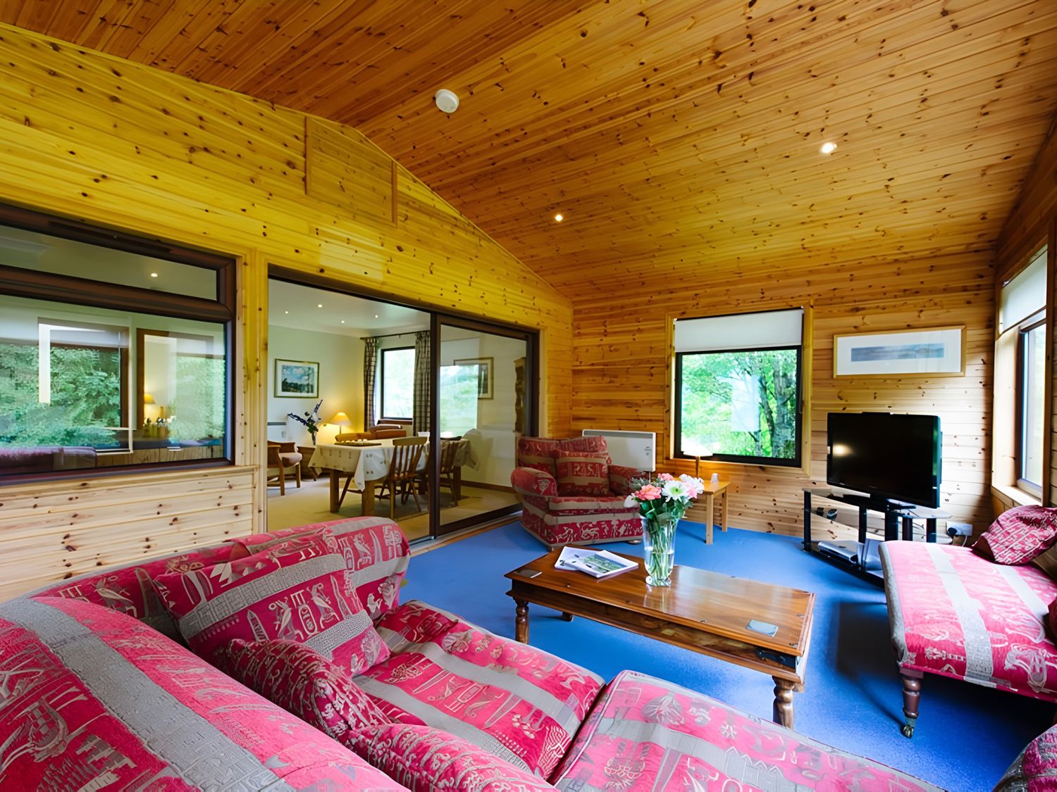 • A living room with sofas and a television at Buzzard Lodge in Crianlarich