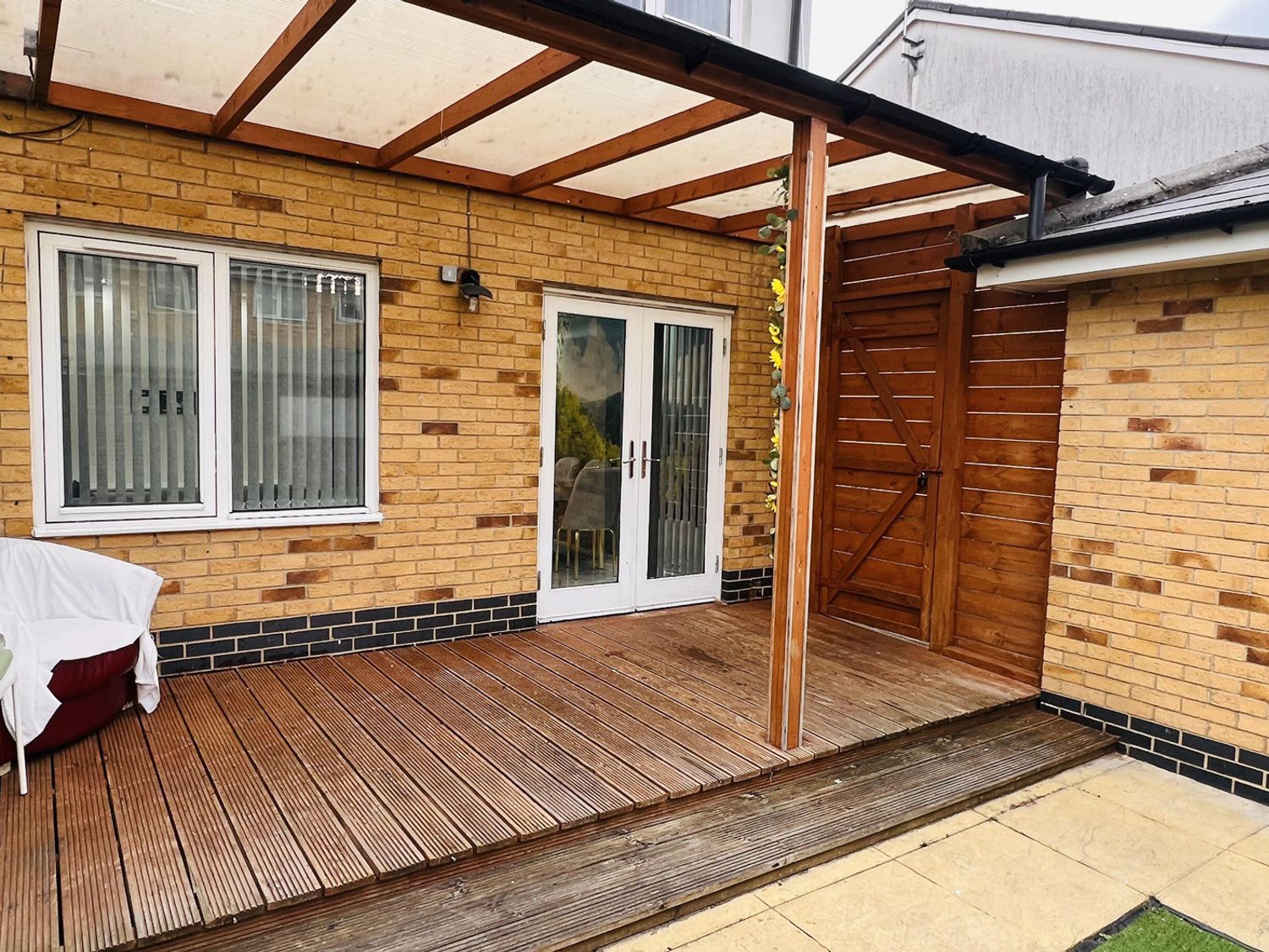 • An outdoor area with a wooden deck and sliding doors at Fairclough Close Northolt