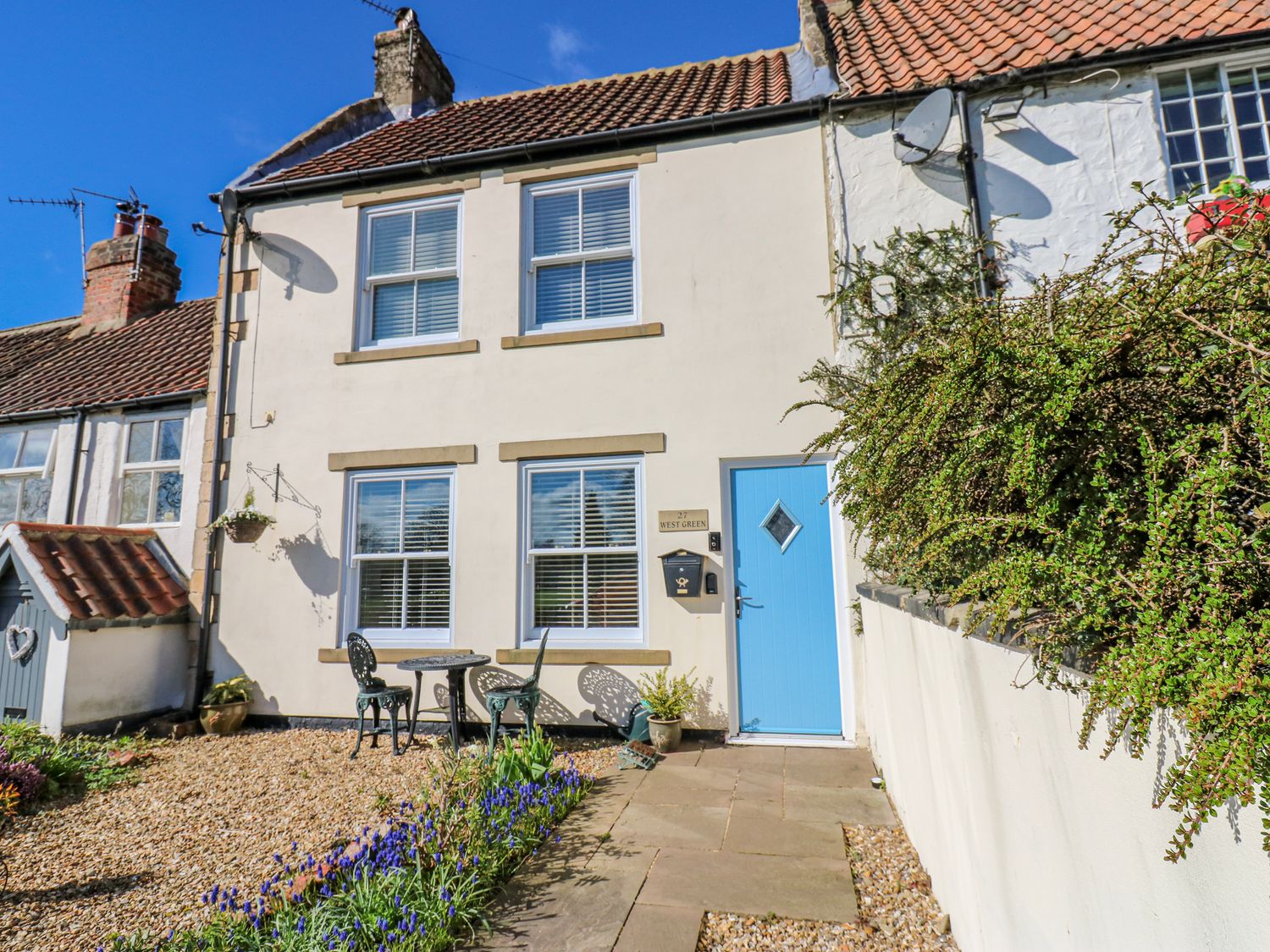 Settled into a picturesque village, this pretty home welcomes you with a front seating area with mature shrubs adding a pop of colour and an eye-catching blue door.