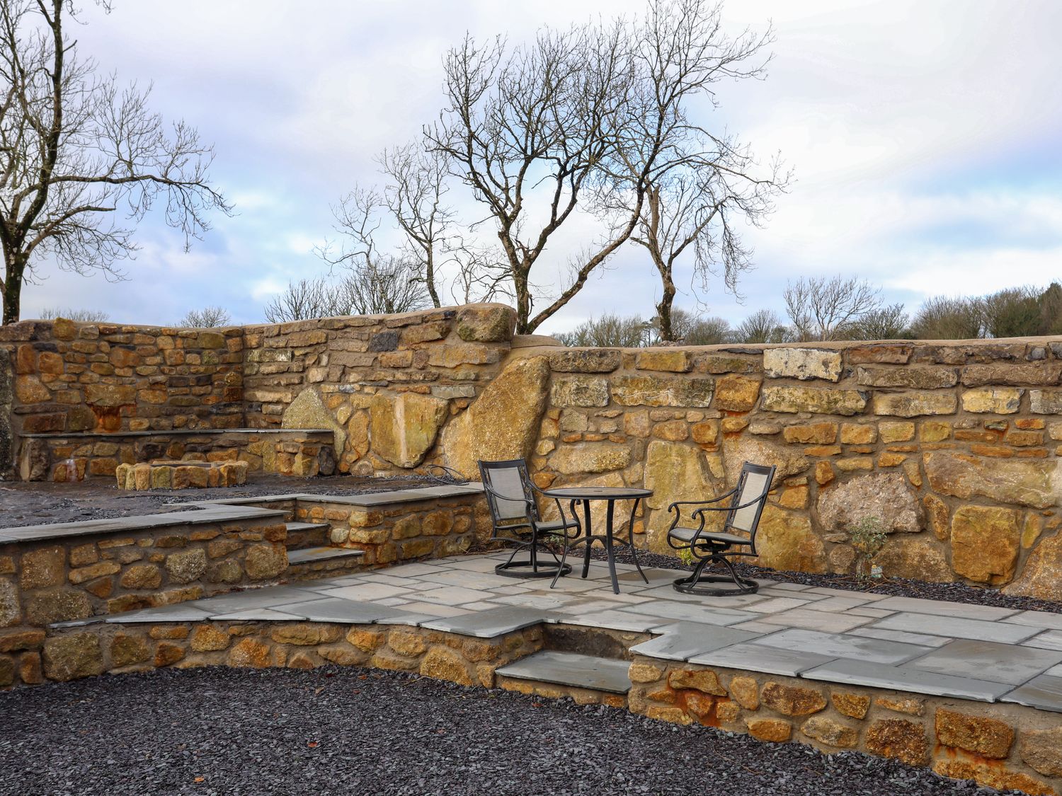 The rear garden is beautifully landscaped, with steps leading up to a lawn and a fire pit, perfect for enjoying cosy evenings outdoors, with blissful countryside views beyond the fence.