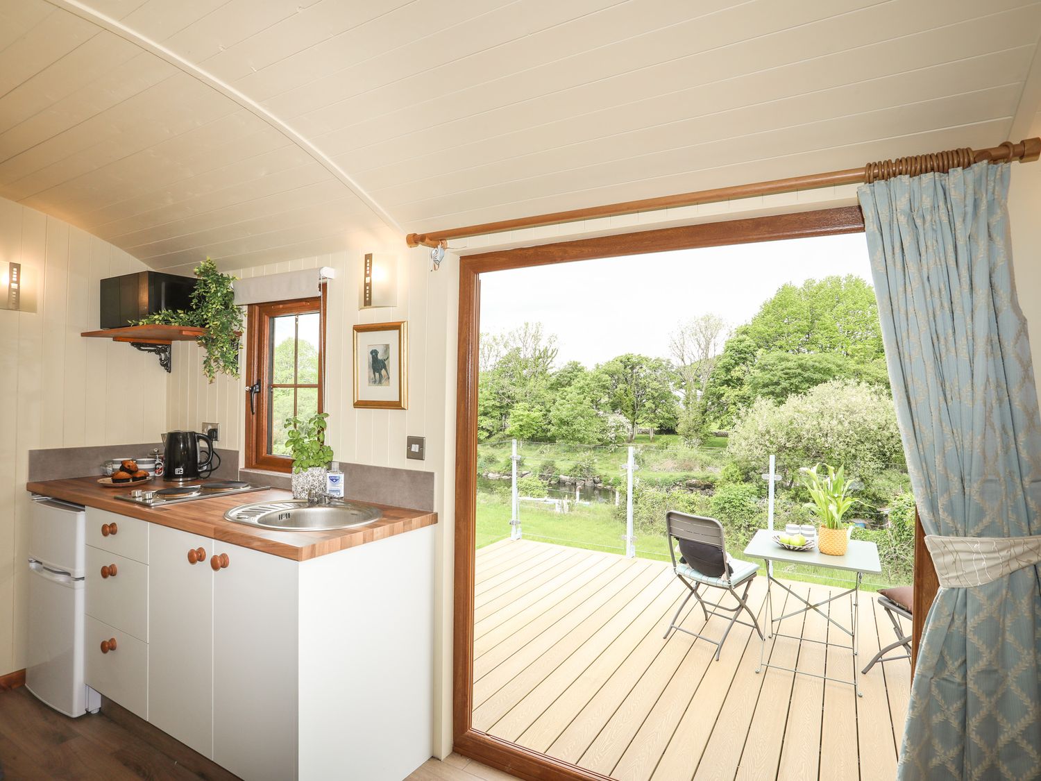 The kitchenette provides basic requirements for a short stay, meals can be enjoyed alfresco on the outdoor decked area overlooking the river.