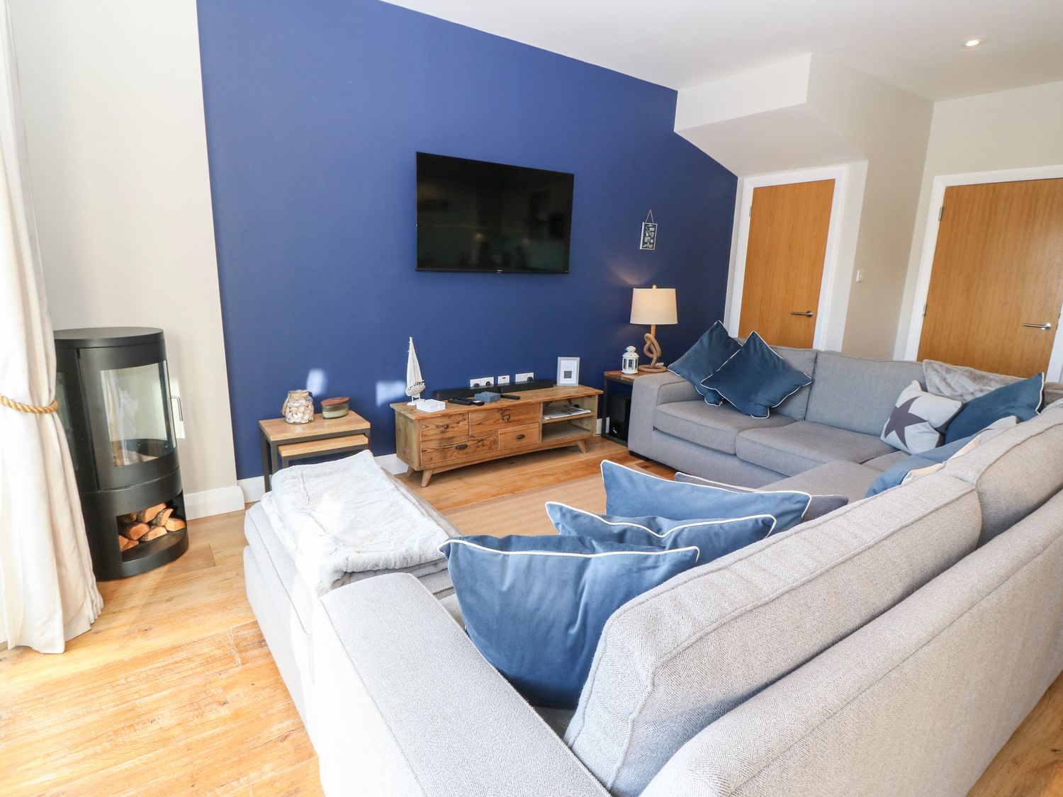 • A living room with a grey sectional sofa and blue cushions a wooden TV stand with a TV and a wood stove at Sandy House in Rhosneigr