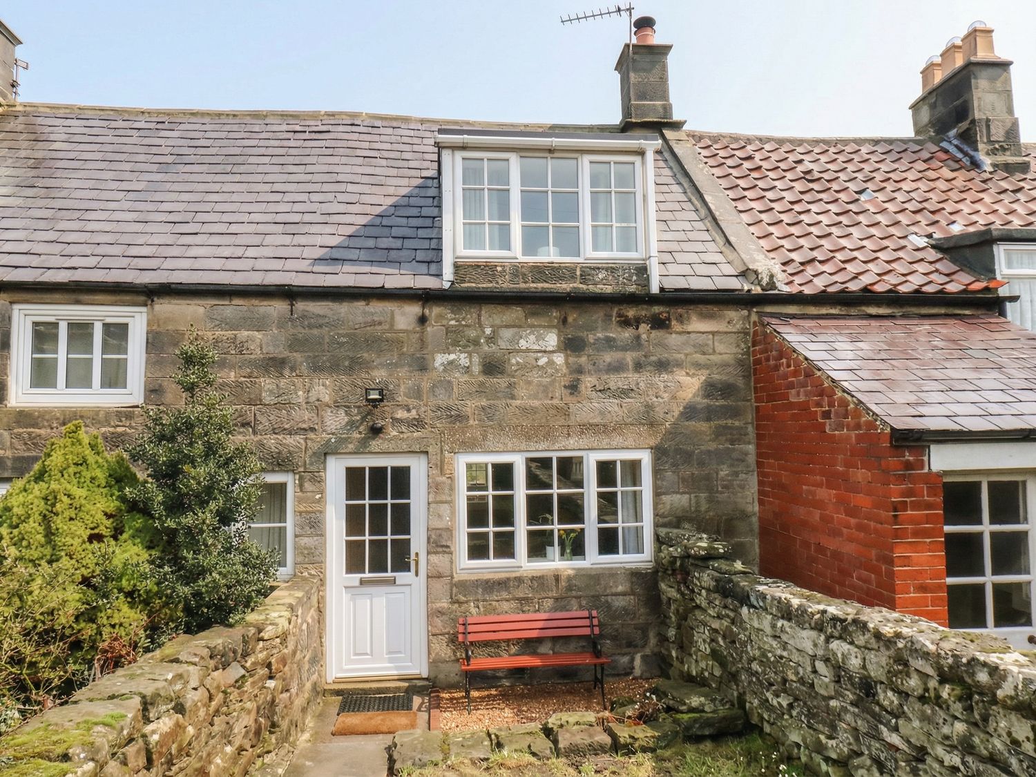 • A cottage exterior with a garden and stone wall at 4 Lilac Cottages