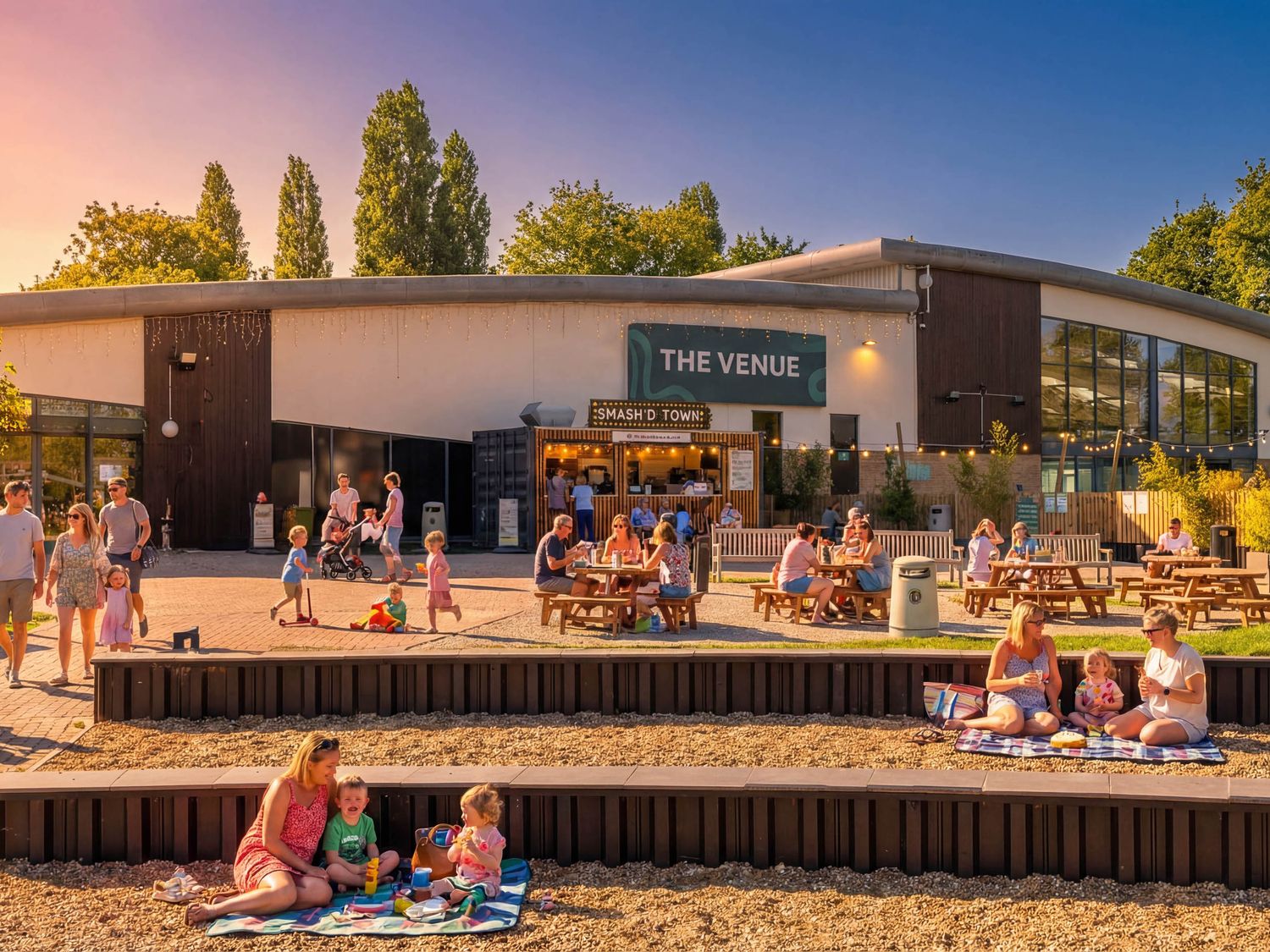 • An outdoor venue with seating and families enjoying at Starlight Skylight - Billing Aquadrome