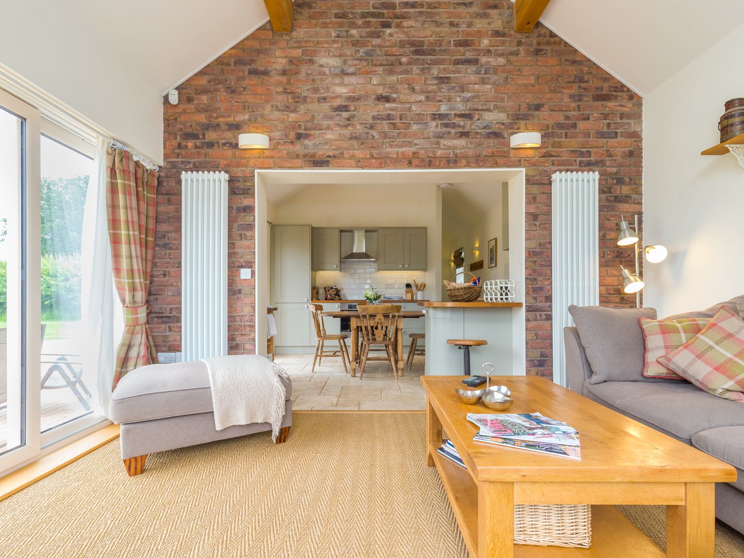 To one side there is a cosy seating area with plush sofas, high ceilings and exposed beams, perfectly complemented by the views to open countryside.