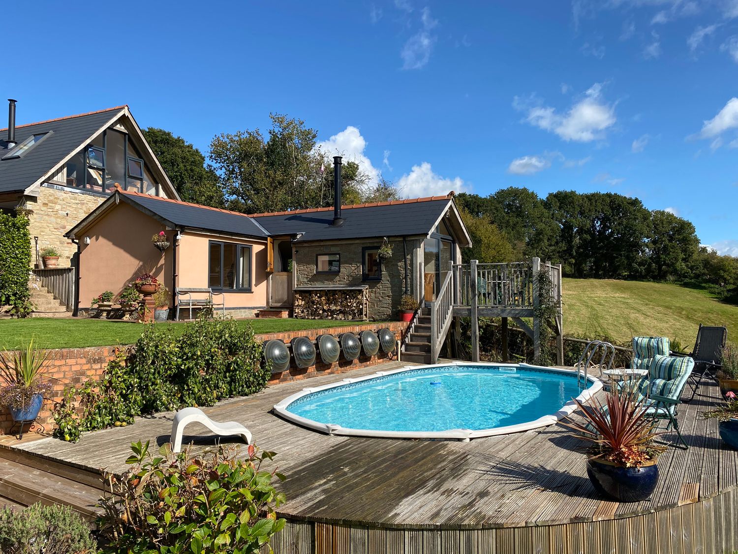 The weather was mostly raining so we didn't use the swimming pool but it looked lovely. Everything was provided that we needed. The decking area was contained so we were happy that our little dog could safely wander in and out. The owners left us in peace to enjoy our stay but were very friendly and helpful. There was no lock on the bathroom door which we would have preferred but otherwise a great holiday for a couple looking for a tranquil little retreat.